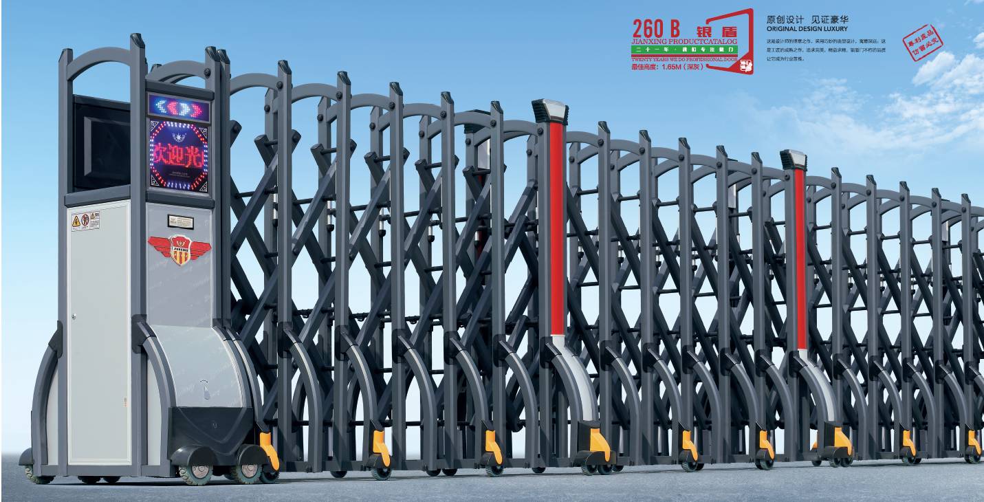 伸縮門(mén)(Retractable door),就是門(mén)體可以伸縮自由移動(dòng),來(lái)控制門(mén)洞大小、來(lái)控制行人或車(chē)輛的攔截和放行的一種門(mén)。伸縮門(mén)主要由門(mén)體、驅(qū)動(dòng)電機(jī),滑道、控制系統(tǒng)構(gòu)成。門(mén)體采用優(yōu)質(zhì)不銹鋼及鋁合金專(zhuān)用型材制作,采用平行四邊形原理鉸接,伸縮靈活行程大。驅(qū)動(dòng)器采用特種電機(jī)驅(qū)動(dòng),蝸桿蝸輪減速,并設(shè)有自動(dòng)離合或手動(dòng)離合器,自動(dòng)離合停電時(shí)可自動(dòng)啟閉,手動(dòng)離合停電時(shí)可手動(dòng)啟閉,控制系統(tǒng)有控制板,按鈕開(kāi)關(guān),另可根據(jù)需求配備無(wú)線遙控裝置。